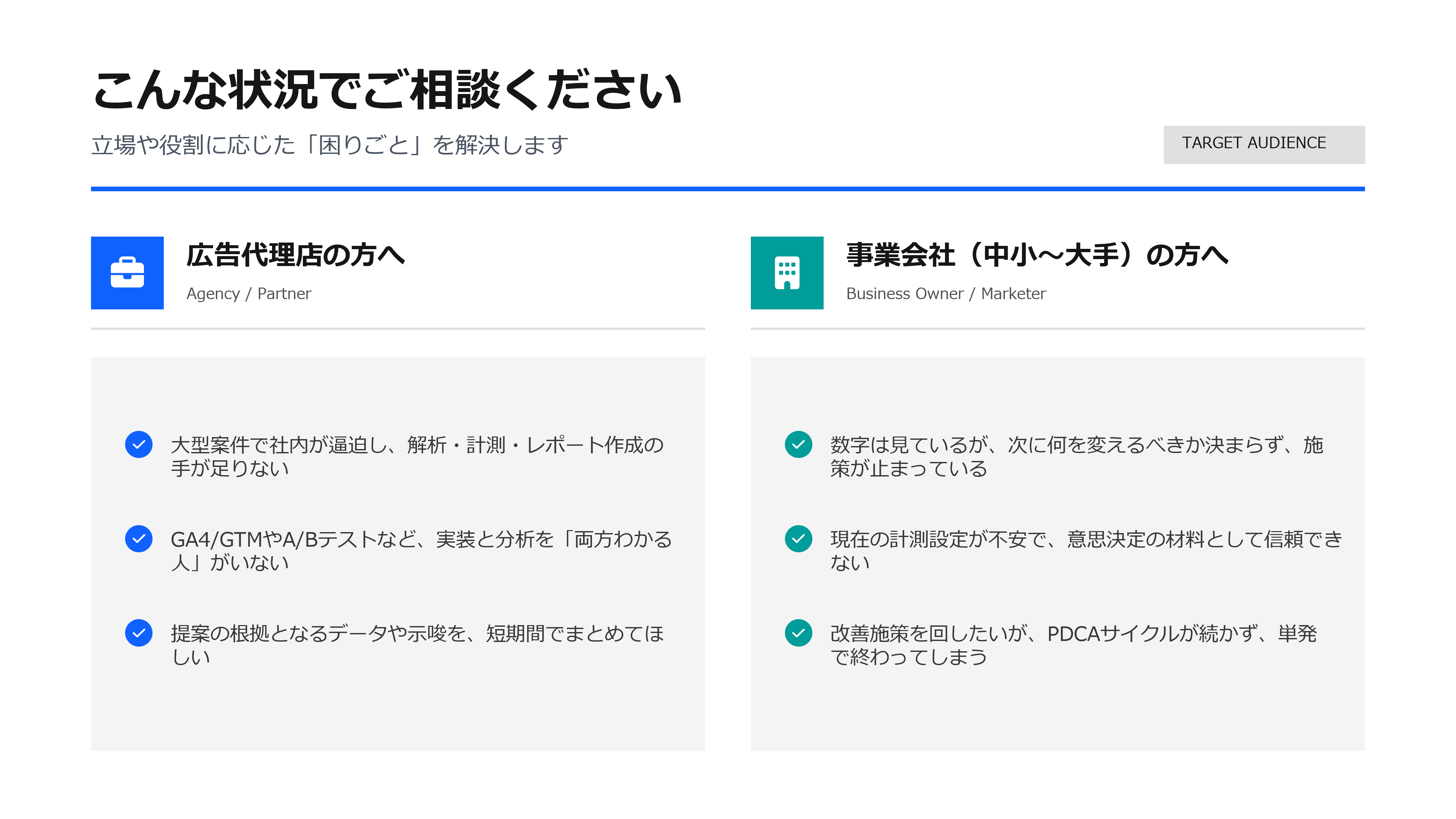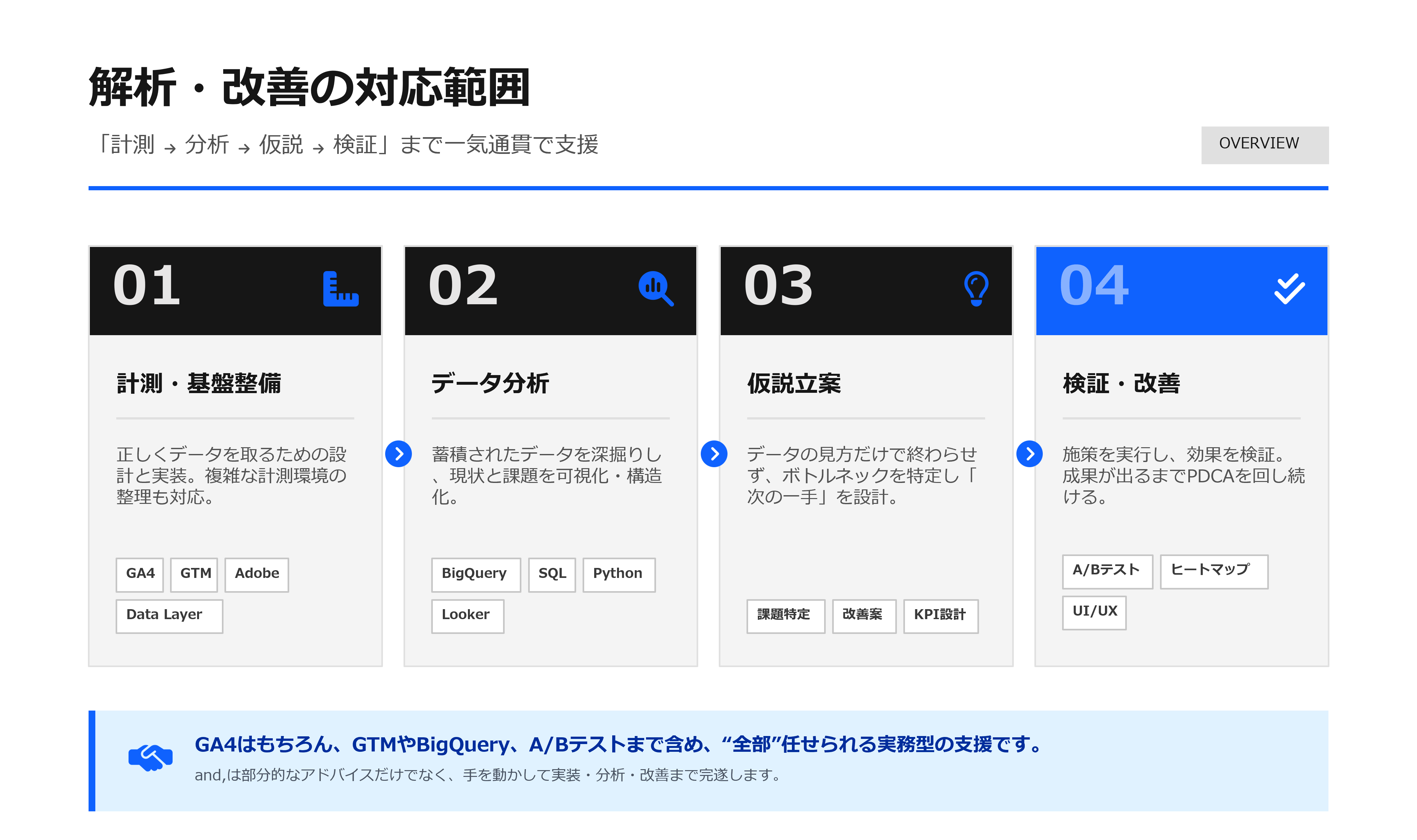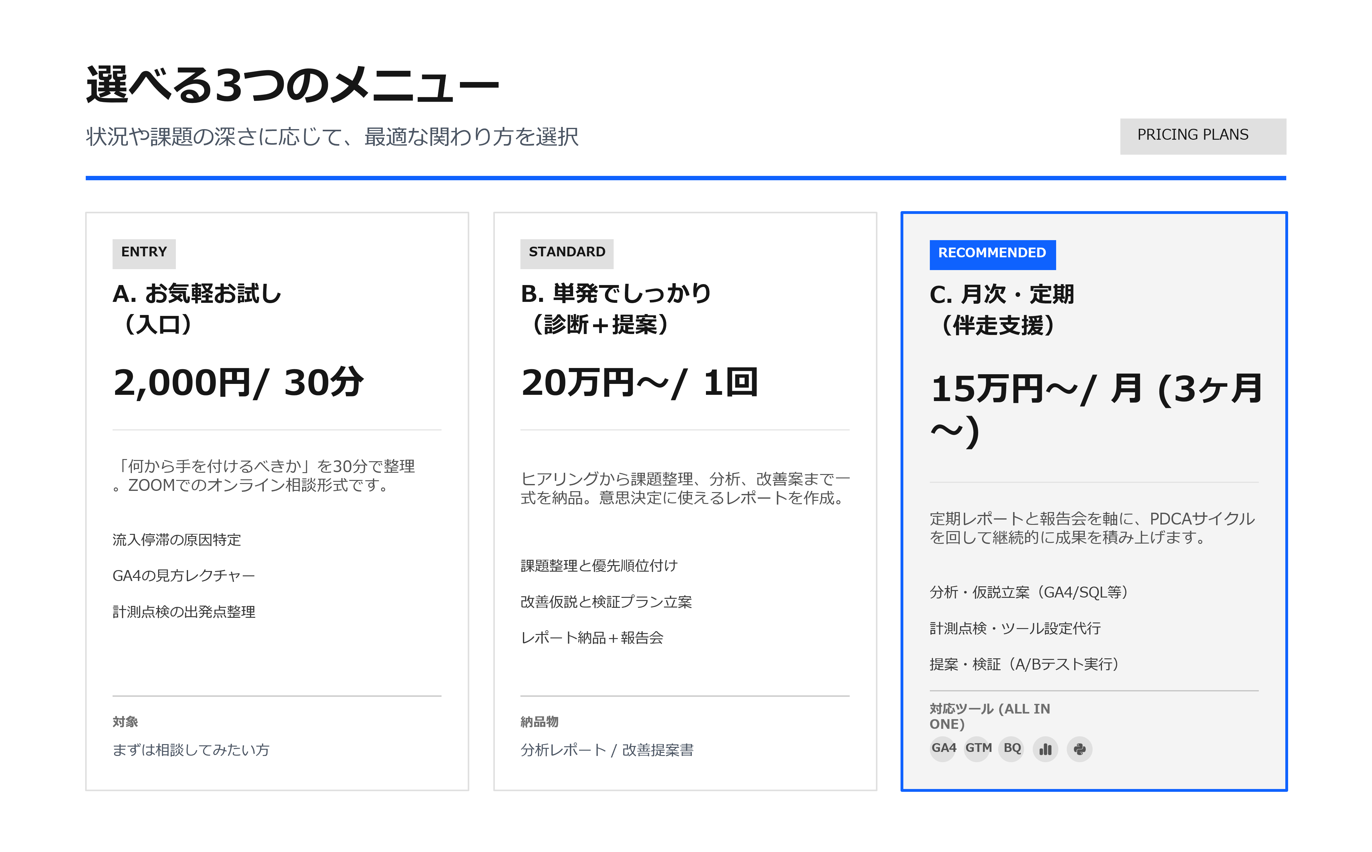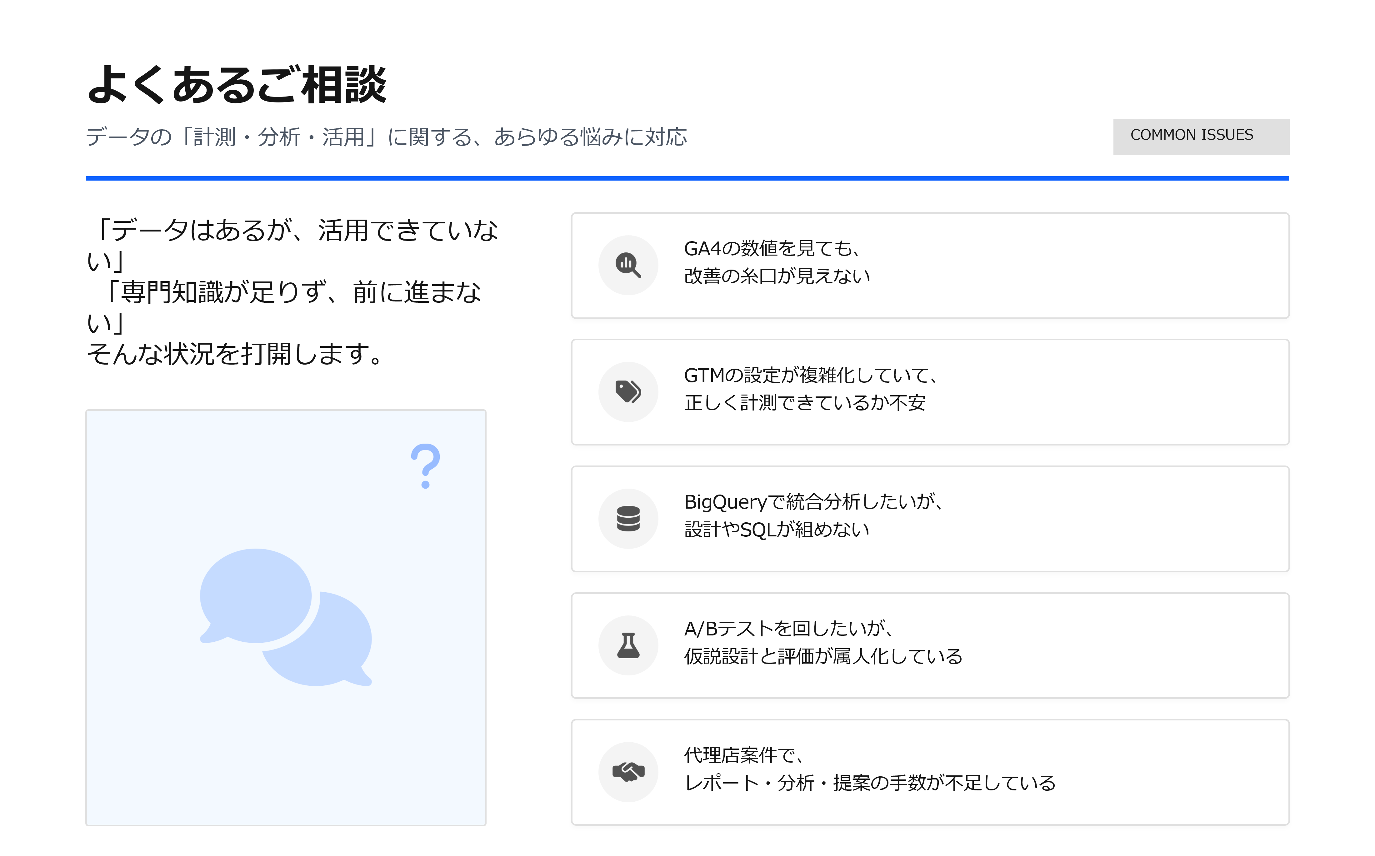 GA4はもちろん、GTMやBigQuery、A/Bテストまで含め、“全部”任せられる実務型の支援です。