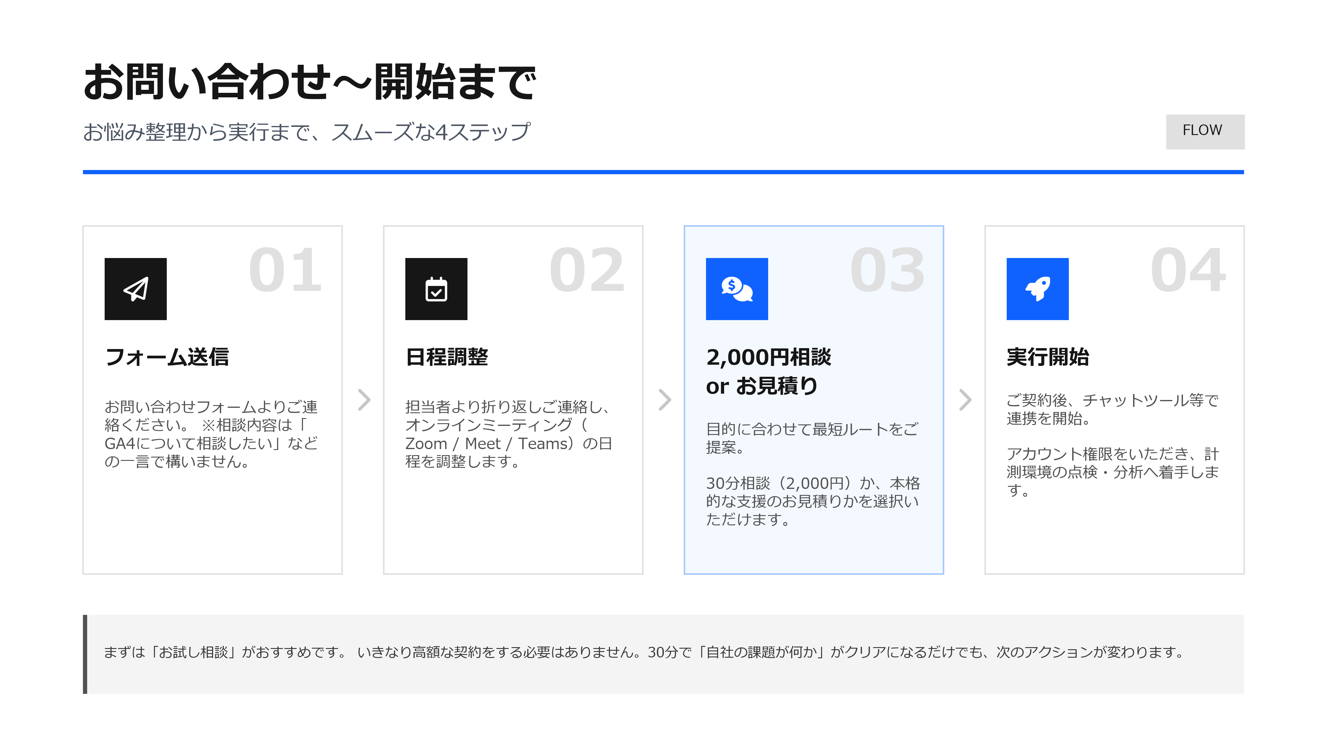 A. 迷ったらまず30分相談で、最短の進め方をご提案します。