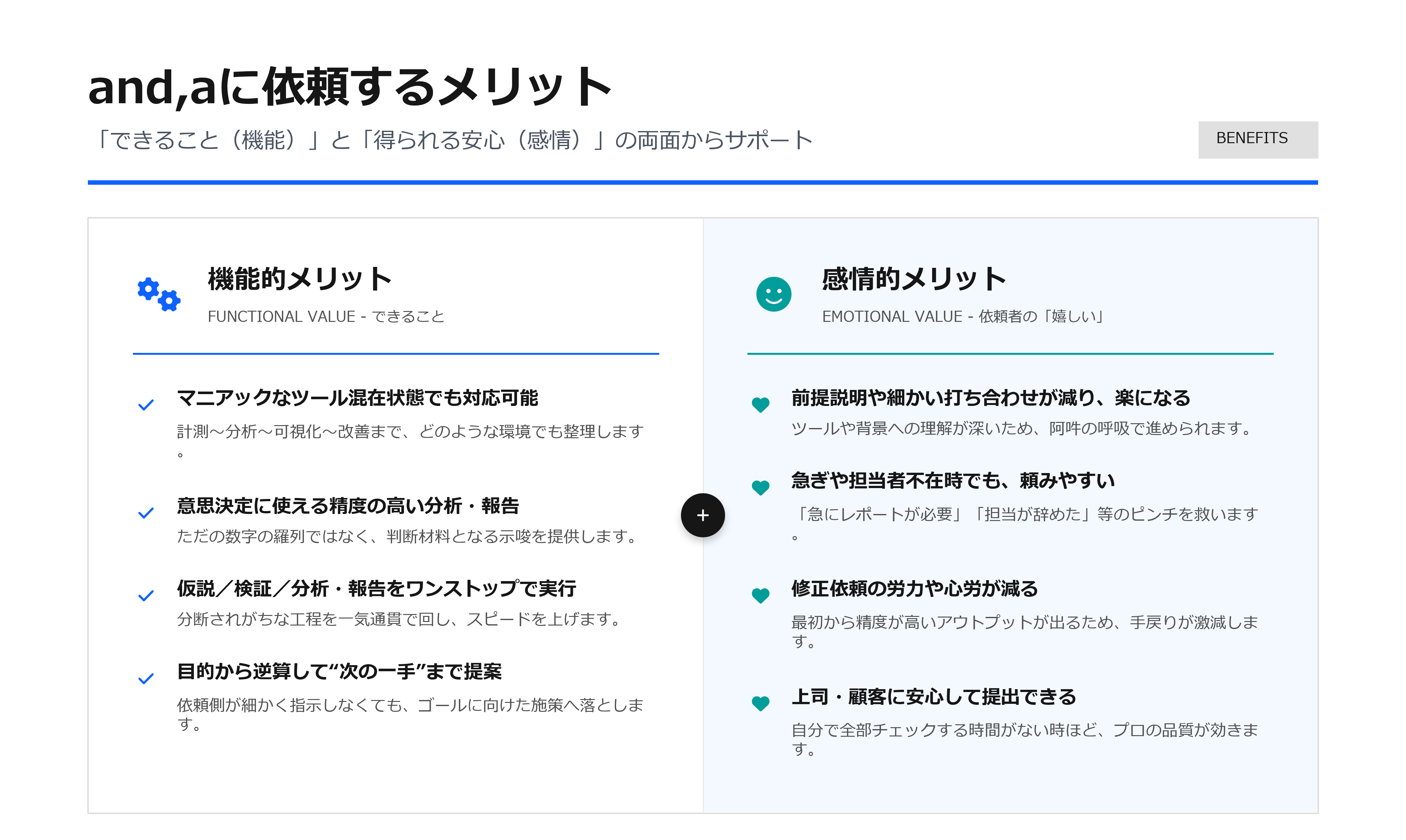 and,aは、「ツールが混在していても前に進める」ことと、「依頼側が事細かに指定しなくても、仮説→検証→報告まで自律的に回す」ことに強みがあります。
