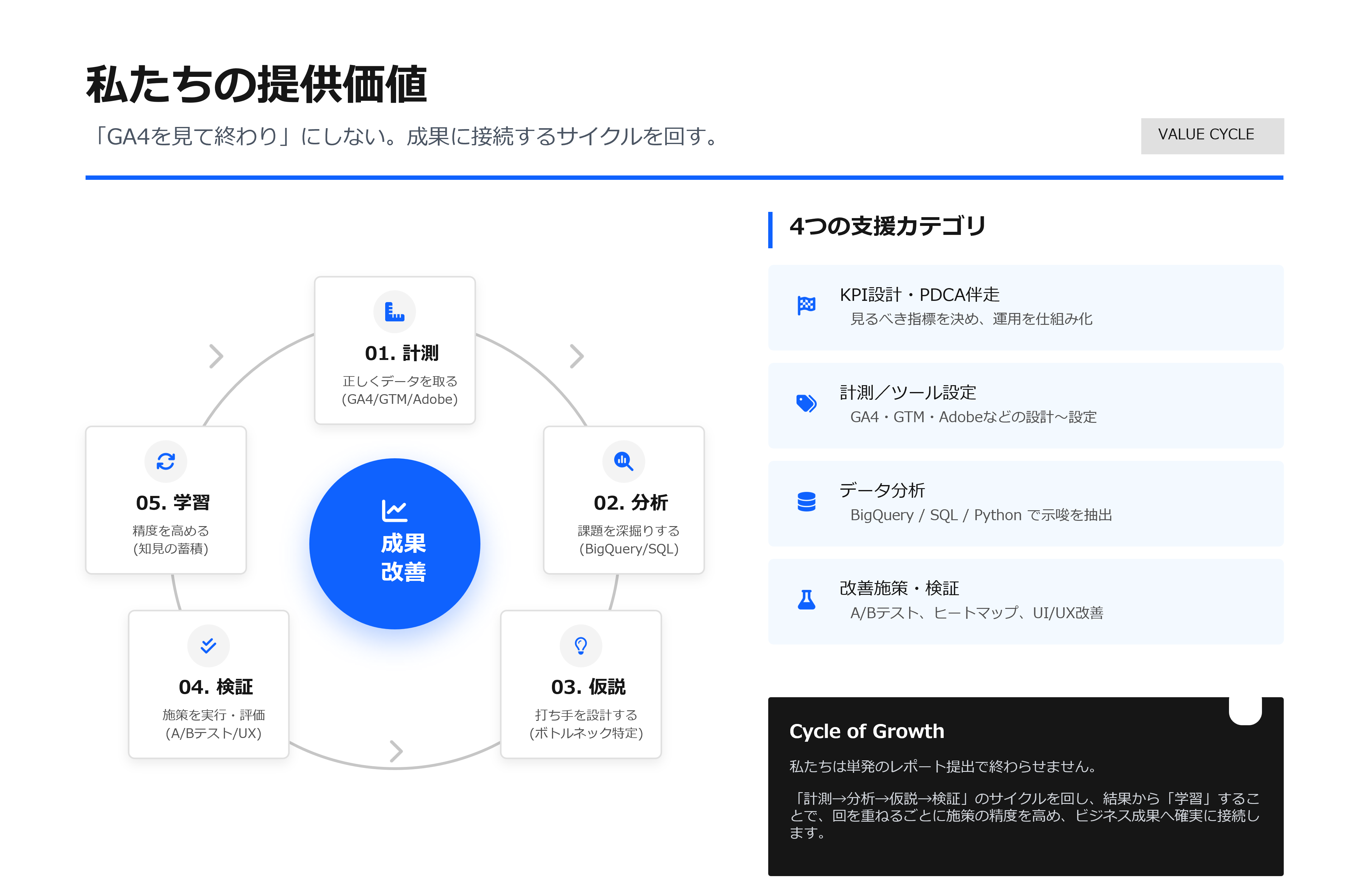 and,aは、“計測 → 分析 → 仮説 → 検証 → 学習”のループを回し、改善の精度を上げます。