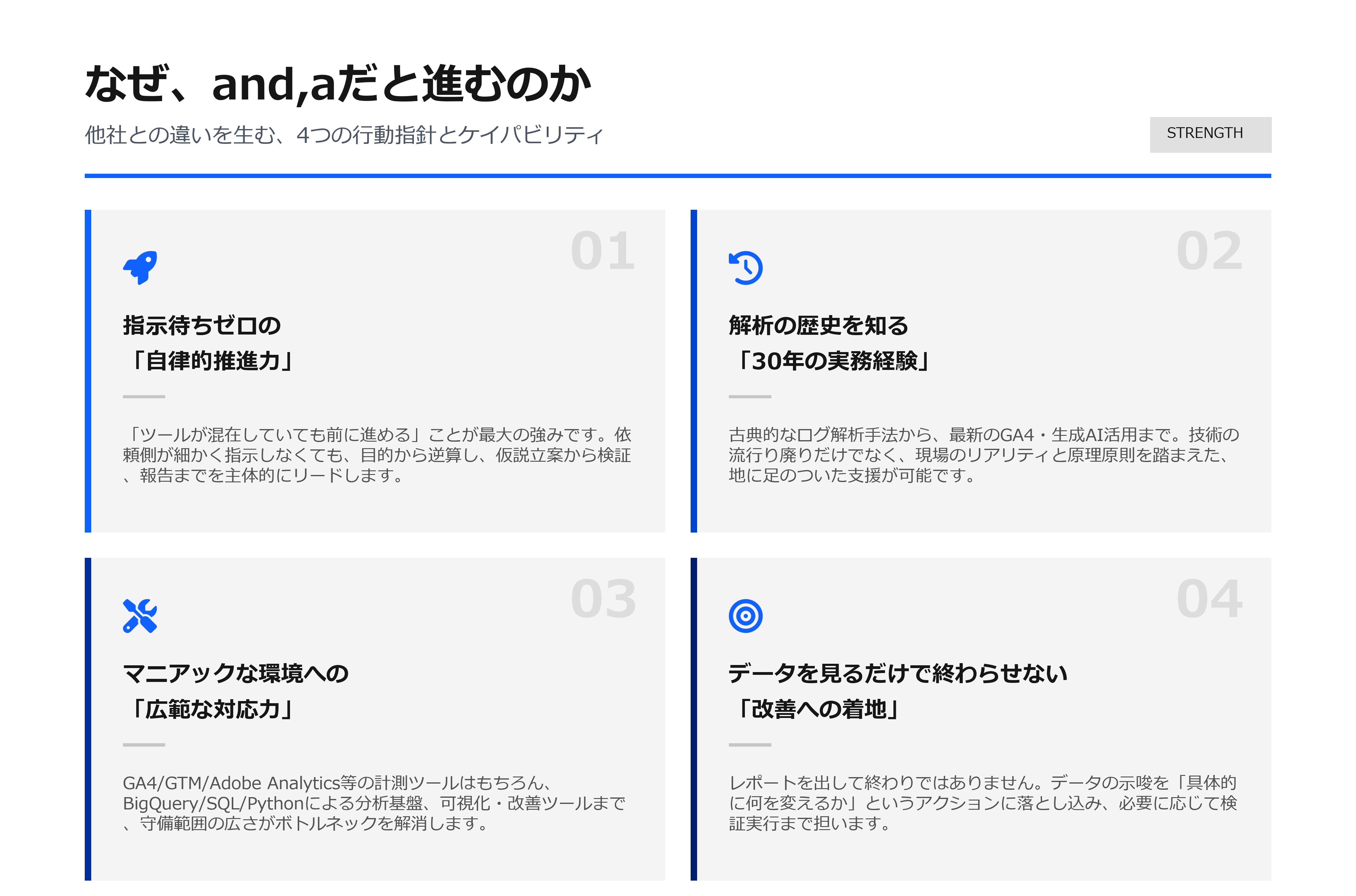 and,aのウェブ解析チームは、約30年の実務経験を背景に、計測・分析・改善を「使える形」に落とし込みます。