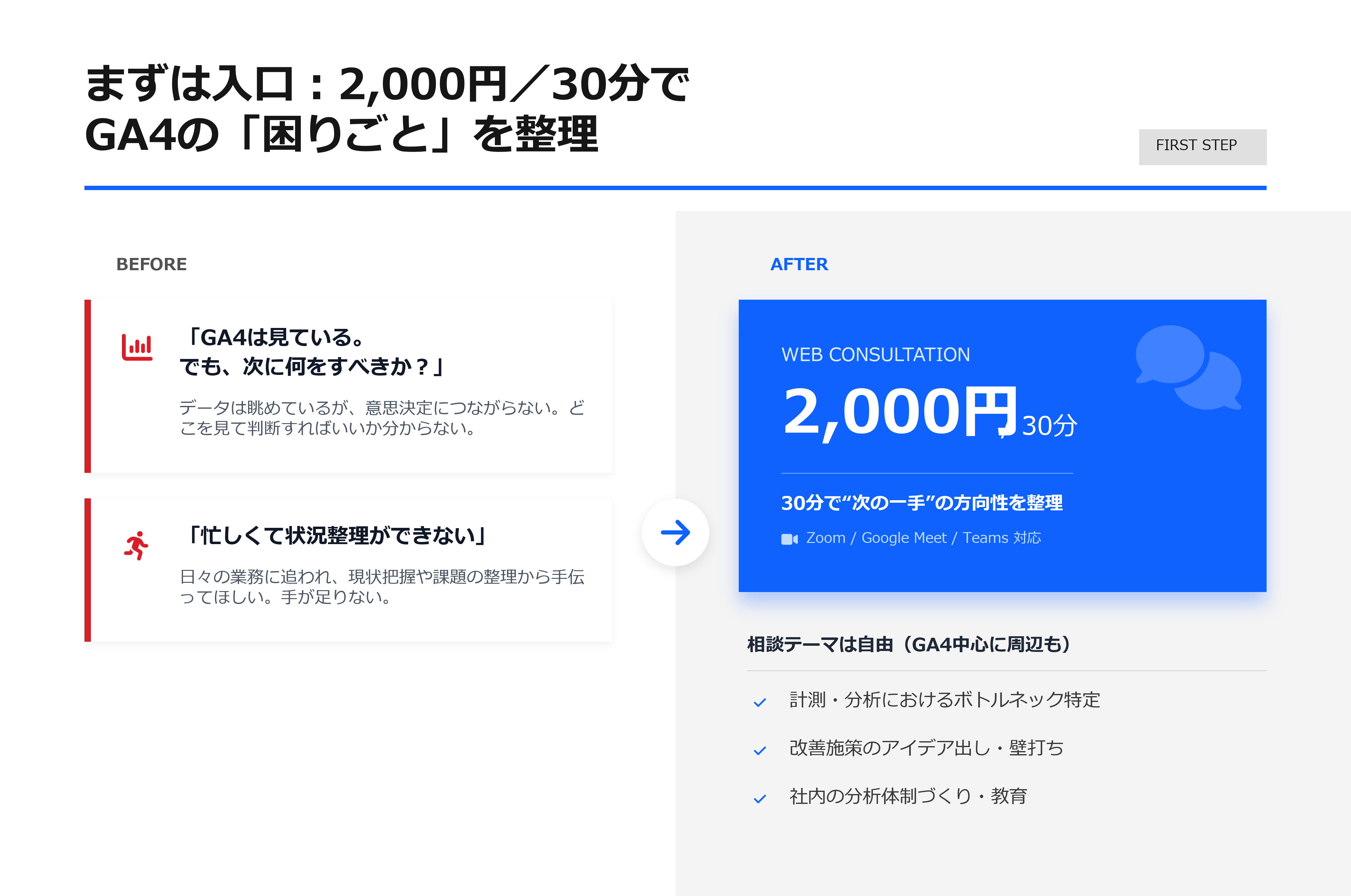 計測・分析・改善・体制づくりまで、相談テーマは自由(GA4中心に、周辺も含めて整理)